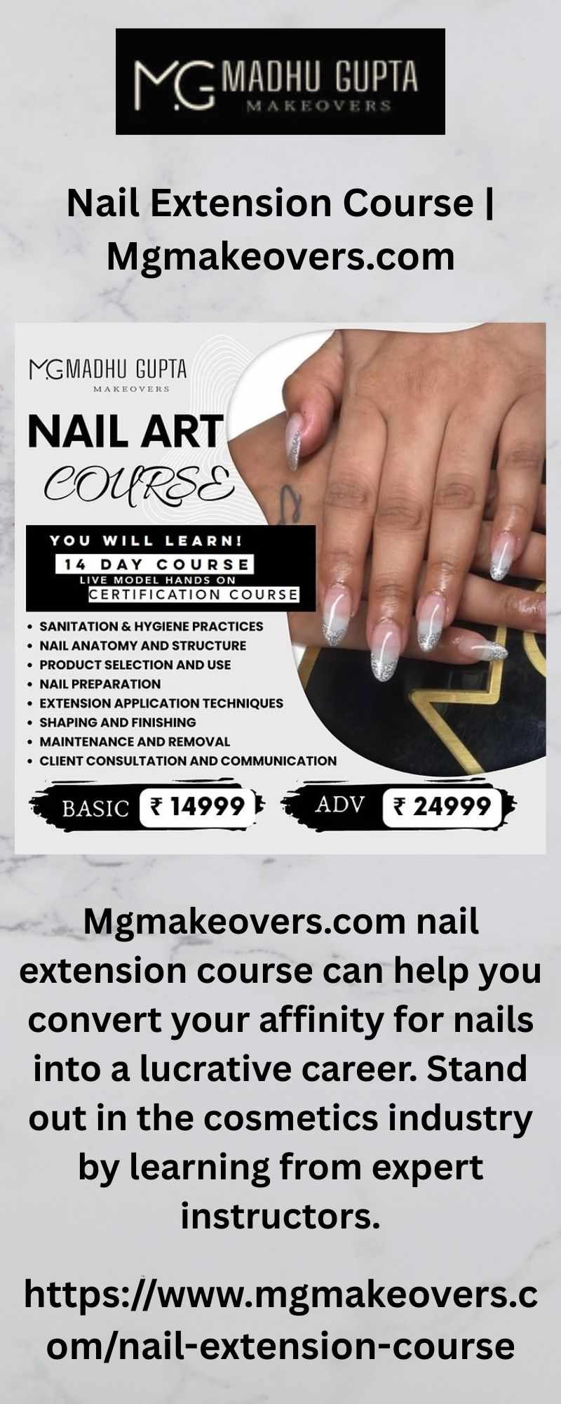 Mgmakeovers.com nail extension course can help you convert your affinity for nails into a lucrative career. Stand out in the cosmetics industry by learning from expert instructors.